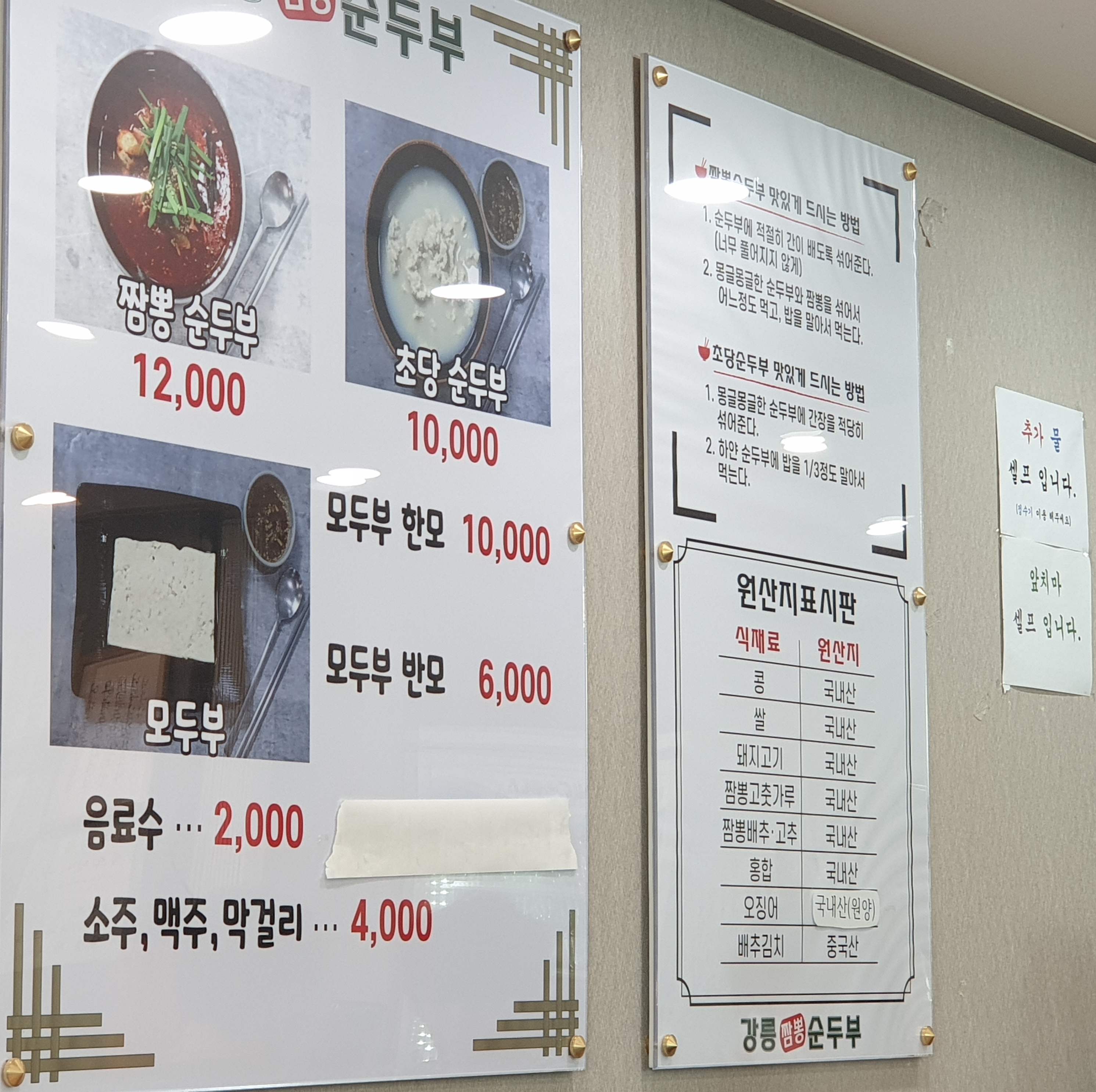 강릉짬뽕순두부 메뉴와 가격입니다.