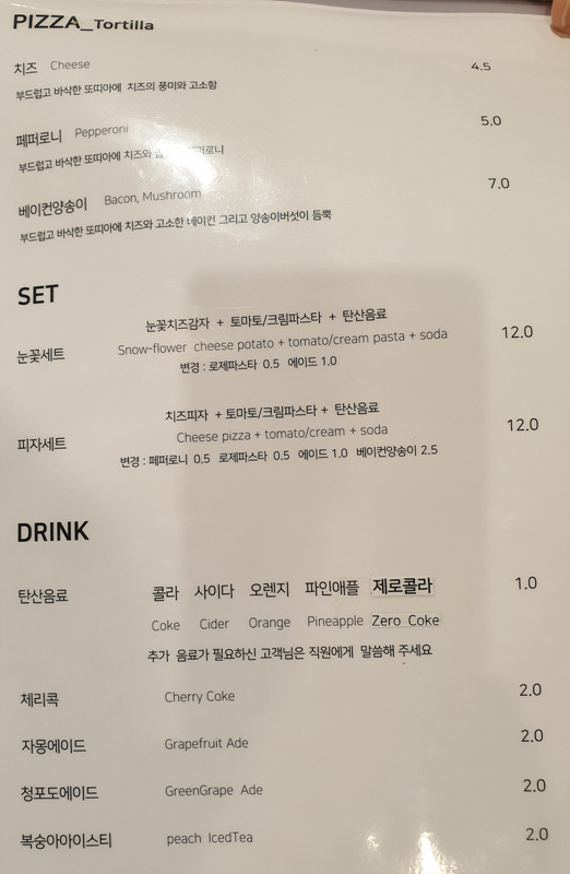 눈꽃세트 (눈꽃치즈감자 + 토마토/크림파스타 중 1종 + 탄산) 12,000원
