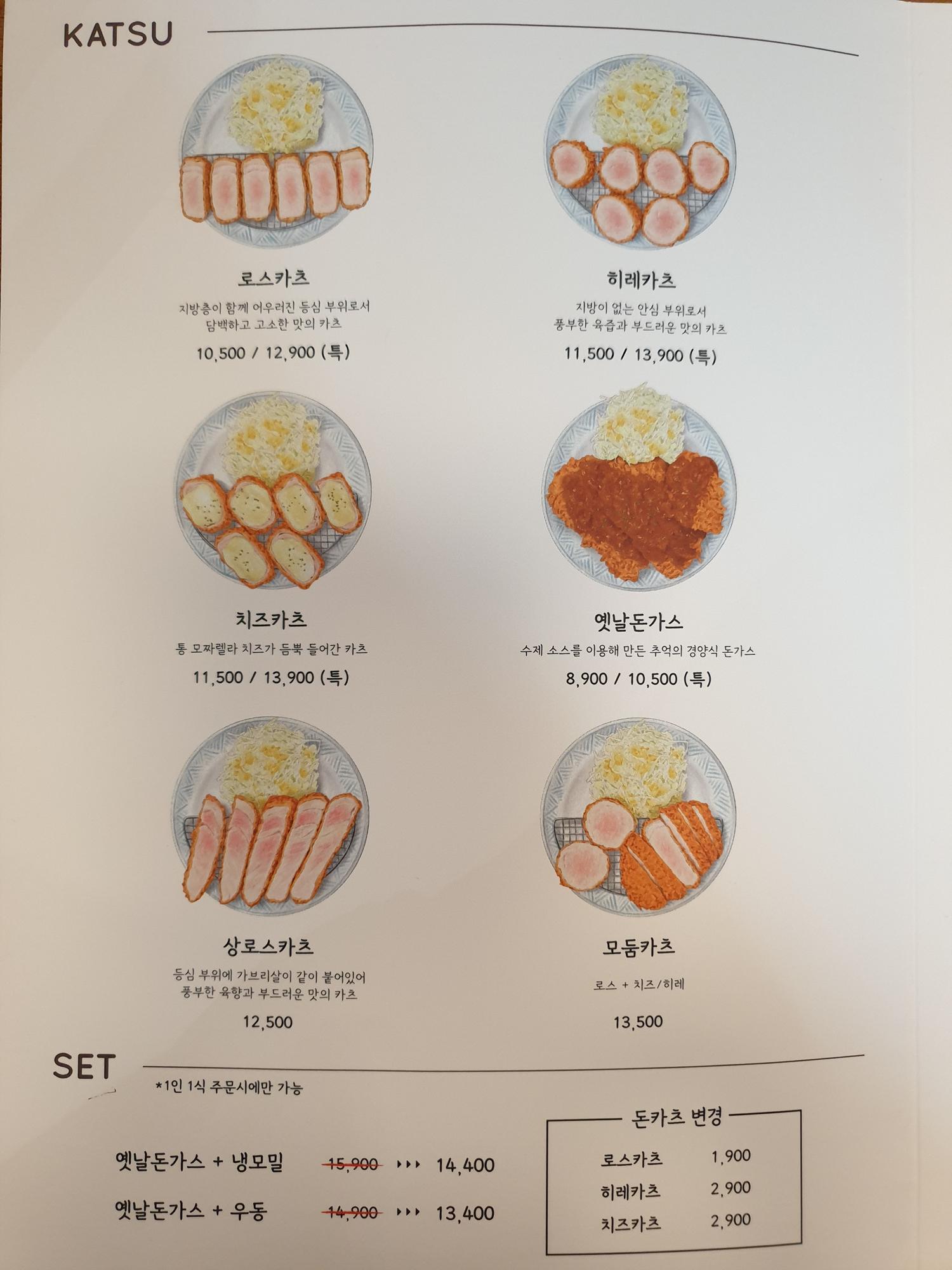 세트메뉴로는 냉모밀과 우동을 선택할 수 있는데 돈카츠 변경이 가능하니