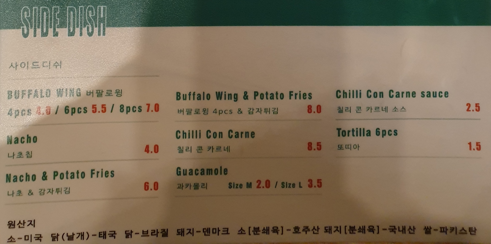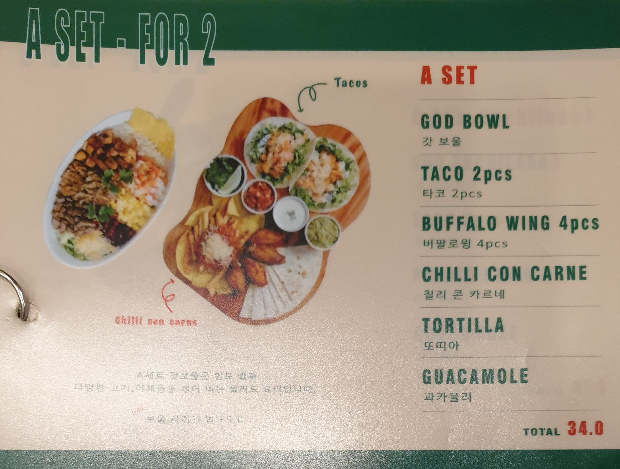 보울 + 타코2 + 버팔로윙4 + 칠리 콘 카르네 + 또띠아 + 과카몰리 소스 등