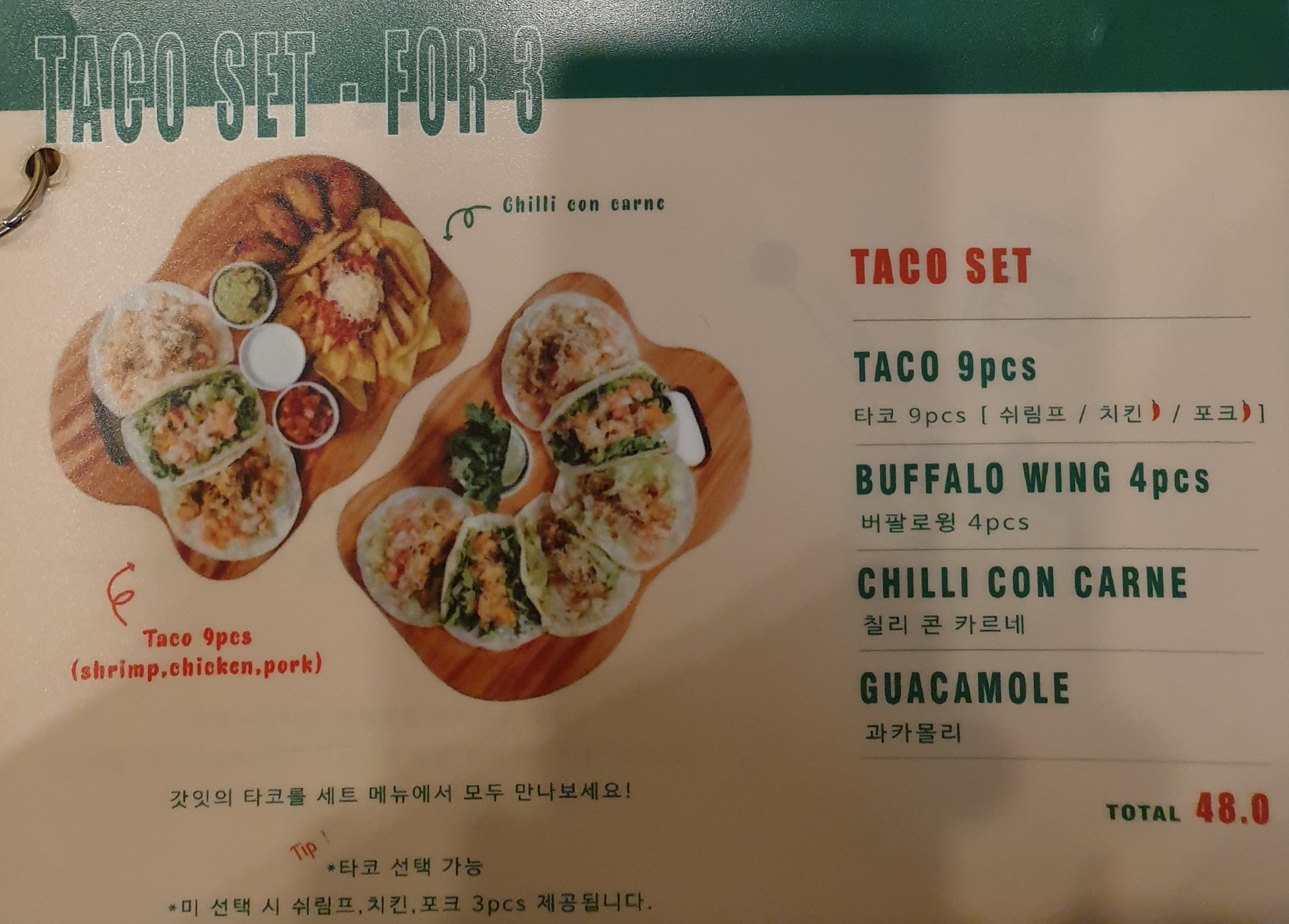 * 타코는 쉬림프, 치킨, 포크중 선택이 가능하며 미 선택시 3피스씩 제공됩니다.