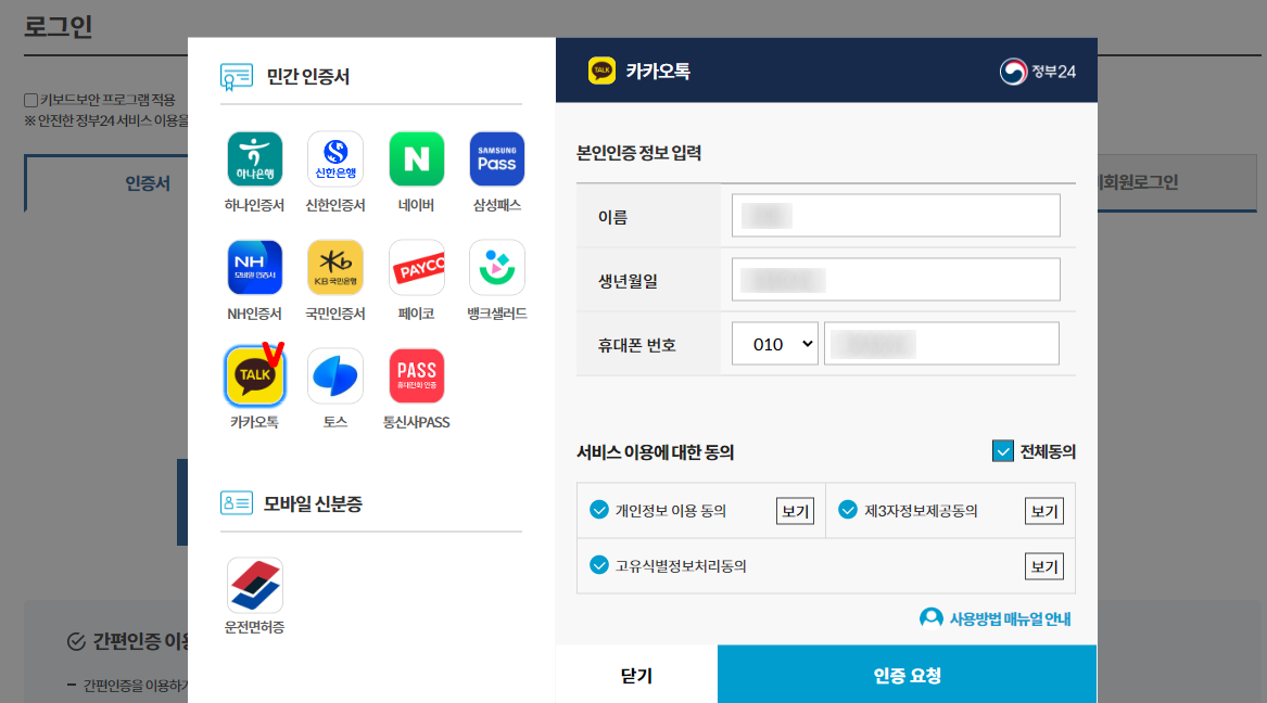 저는 비회원신청 - 간편인증 - 카카오톡으로 인증을 진행했습니다.