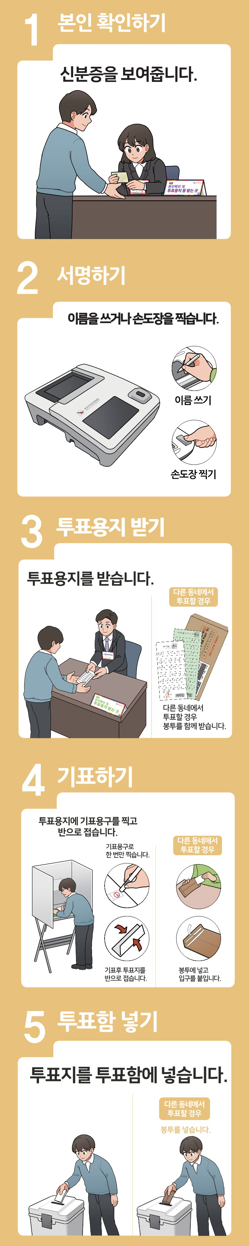 - 관내선거인 (관할 구역 내 주소를 둔 유권자) 1. 신분증 제시 → 본인확인 2. 투표용지 수령 3. 기표소에서 기표 4. 투표함에 투표지 넣고 퇴장 |