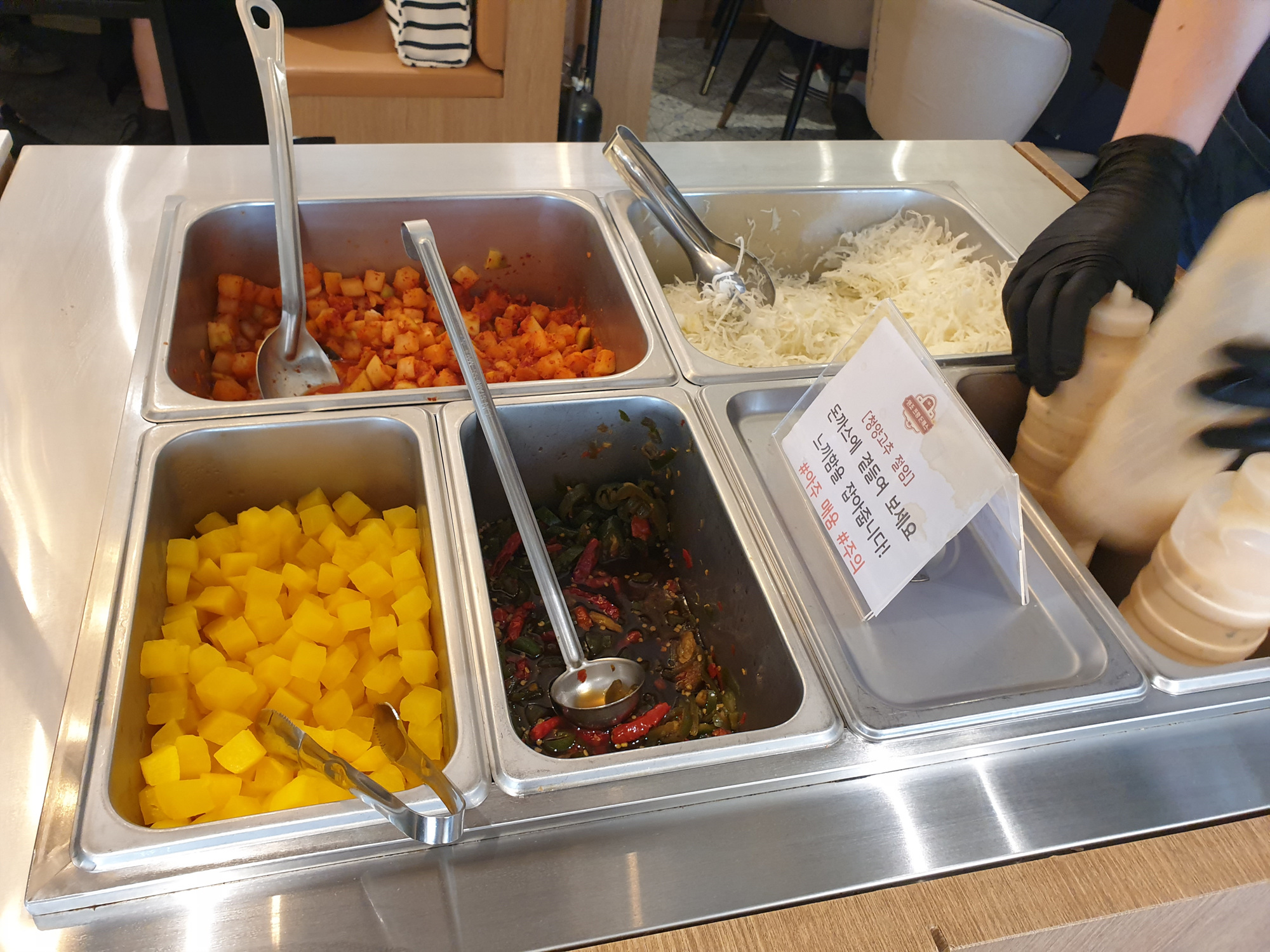 셀프바에는 깍뚜기, 단무지, 양배추채와 소스, 고추절임