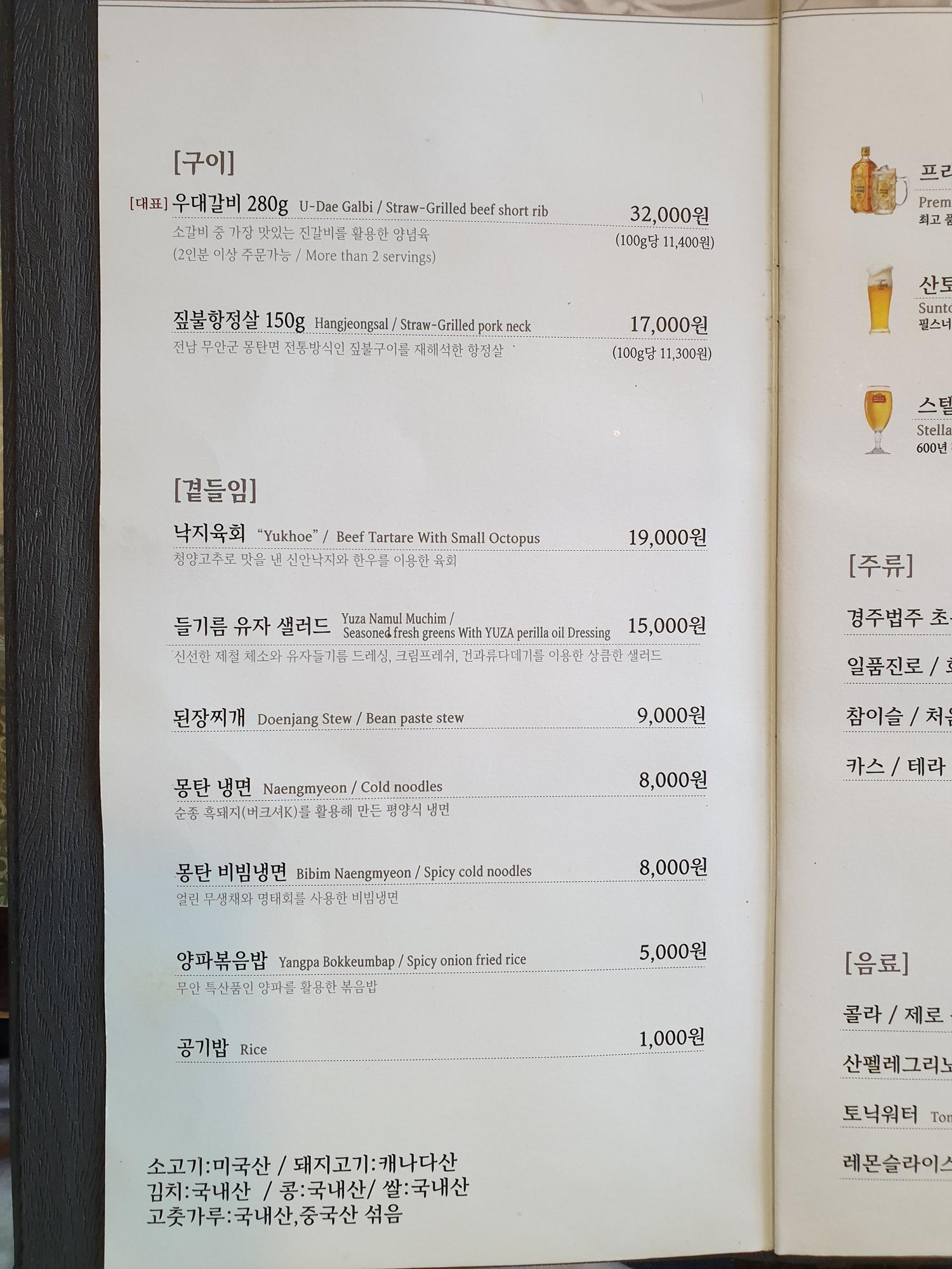 몽탄 메뉴 및 가격
