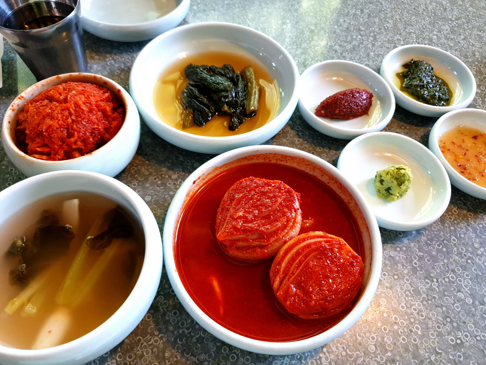 얼린 무생채, 갓짱아찌, 물김치, 양파김치