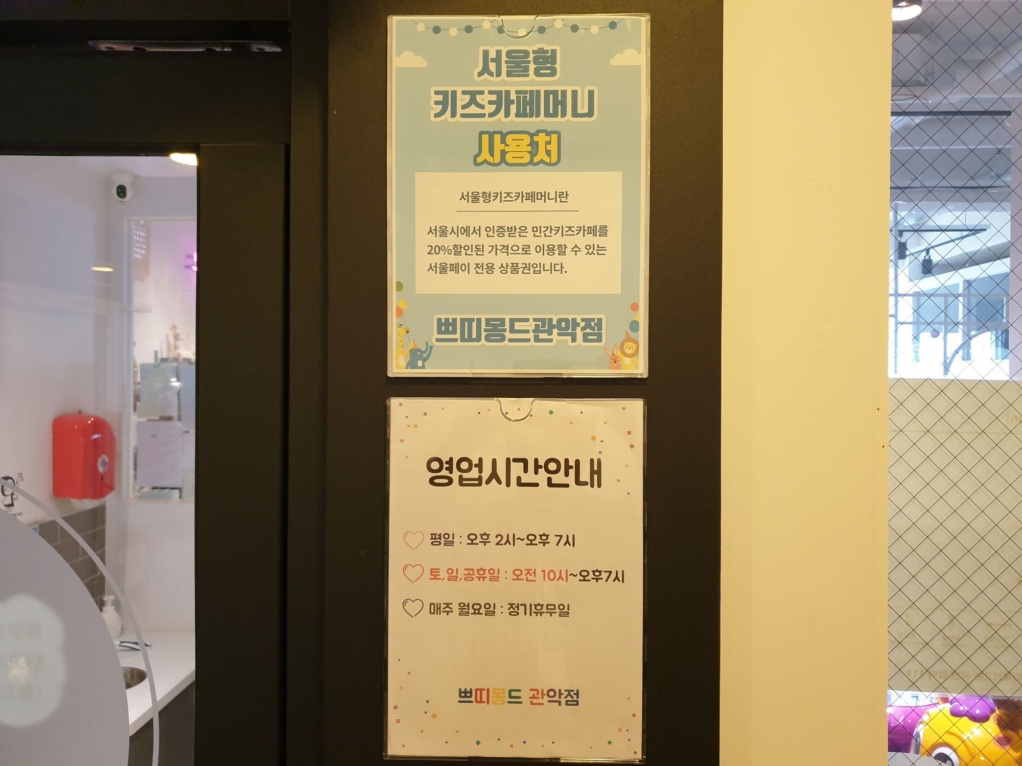 쁘띠몽드 관악점은 서울형키즈카페머니를 사용할 수 있는 가맹점입니다.